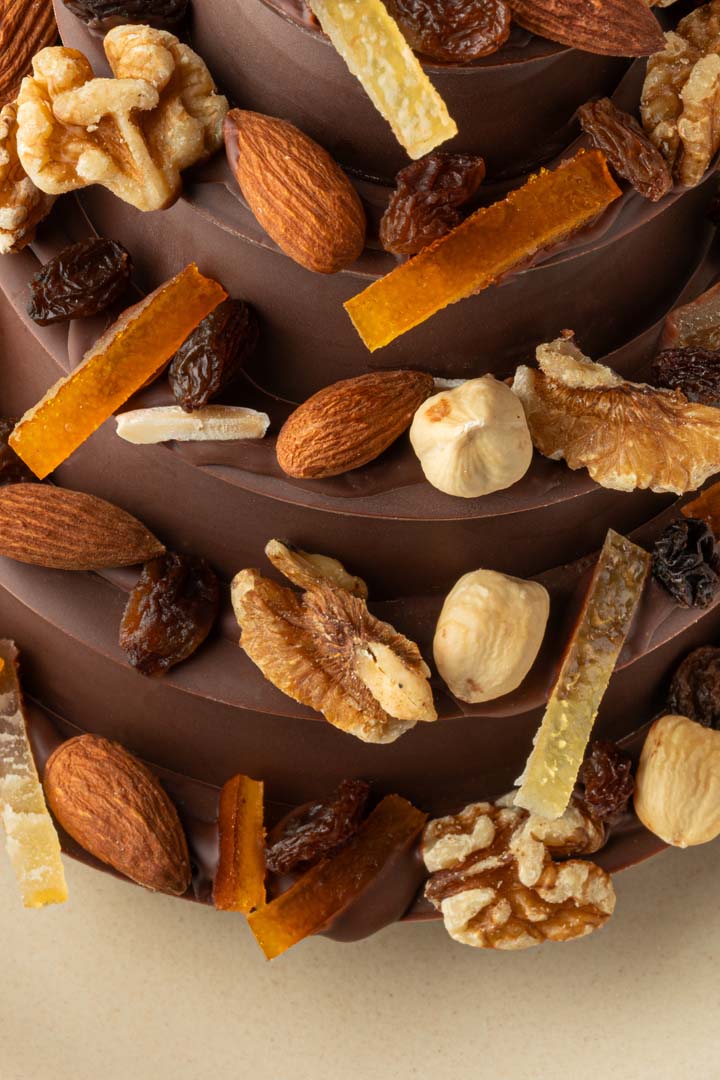 Un sapin en chocolat garni de fruits secs (noix, amandes, noisettes) et de fruits confits (orange, citron). Une alliance de textures et de saveurs pour un Noël gourmand et traditionnel. Son poids est de 200g