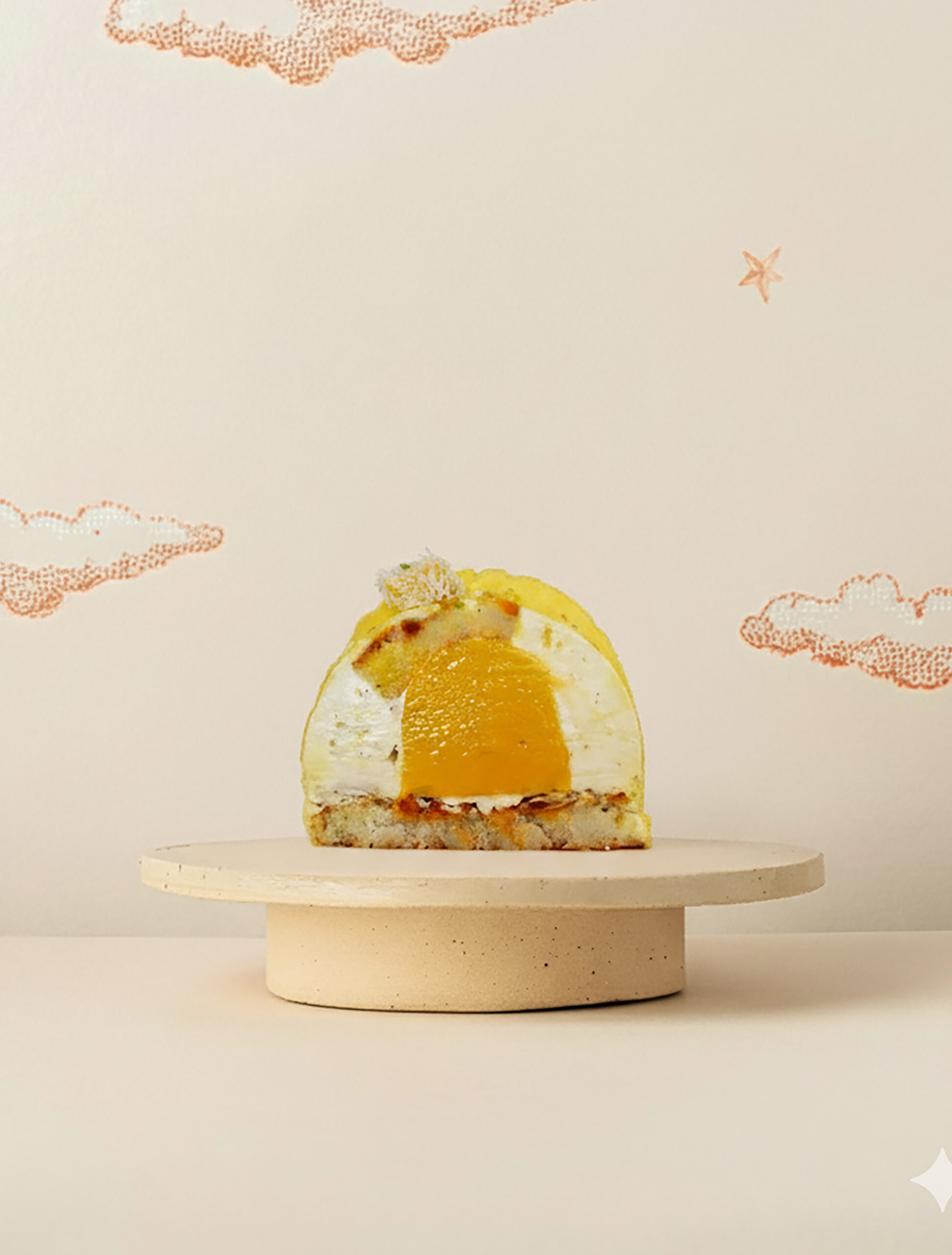 Dacquoise coco, crémeux mangue passion, mousse vanille citron vert